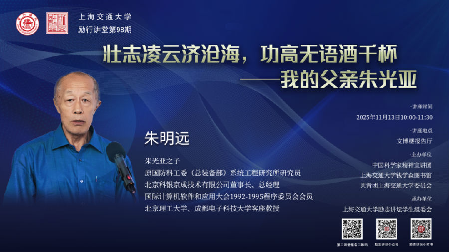 11月13日,“两弹一星”功勋奖章获得者朱光亚院士之子、原国防科工委系统工程研究所研究员朱明远教授做客上海交通大学第98期励行讲堂。在纪念钱学森归国70周年与“两弹结合”试验成功59周年之际,朱教授以“壮志凌云济沧海,功高无语酒千杯——我的父亲朱光亚老照片背后的故事”为主题深情解读朱光亚院士生前的点滴往事与杰出贡献。